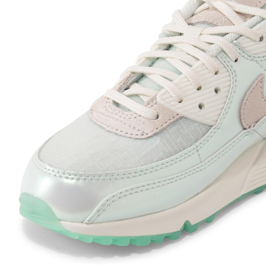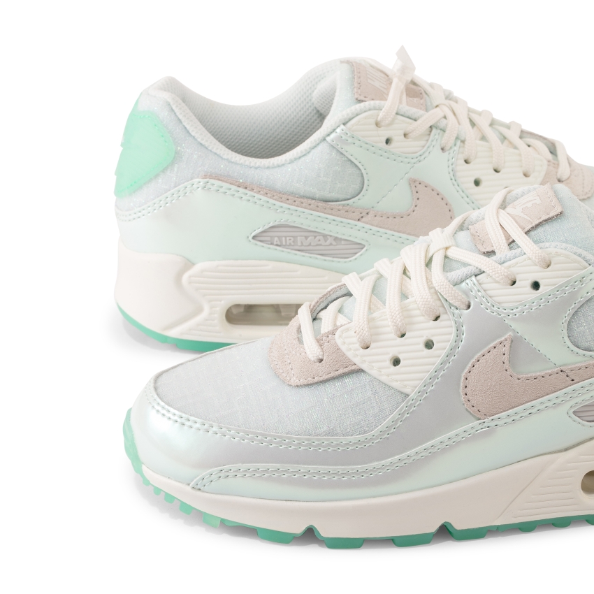 Presented in a Sail, Light Violet, Summit White, and White colour scheme, these Nike Air Max 90 sneakers are detailed with a glittery weave upper with iridescent overlays and mudguards along with suede materials on the toe box, tongue, and Swoosh logos. They're finished with white laces, plastic pieces, and midsole with green heels and translucent outsoles along with glittered-translucent Nike Swoosh.