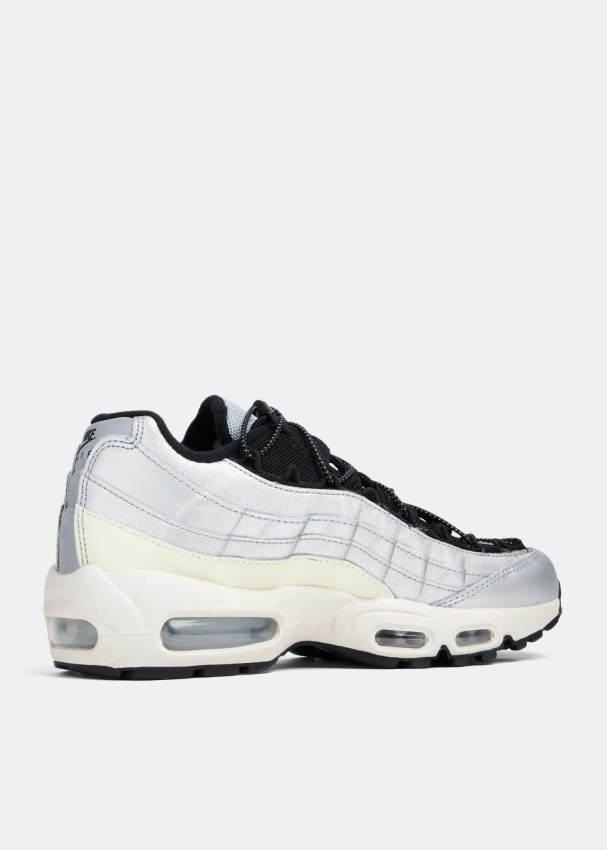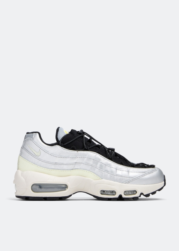 This season's version of the Nike Air Max 95 sneakers arrives in a 'Metallic Silver, Alabaster, and Black' colourway. The leather and mesh upper features 3M reflective detailing and a toggle lacing system atop a two-tone rubber sole.