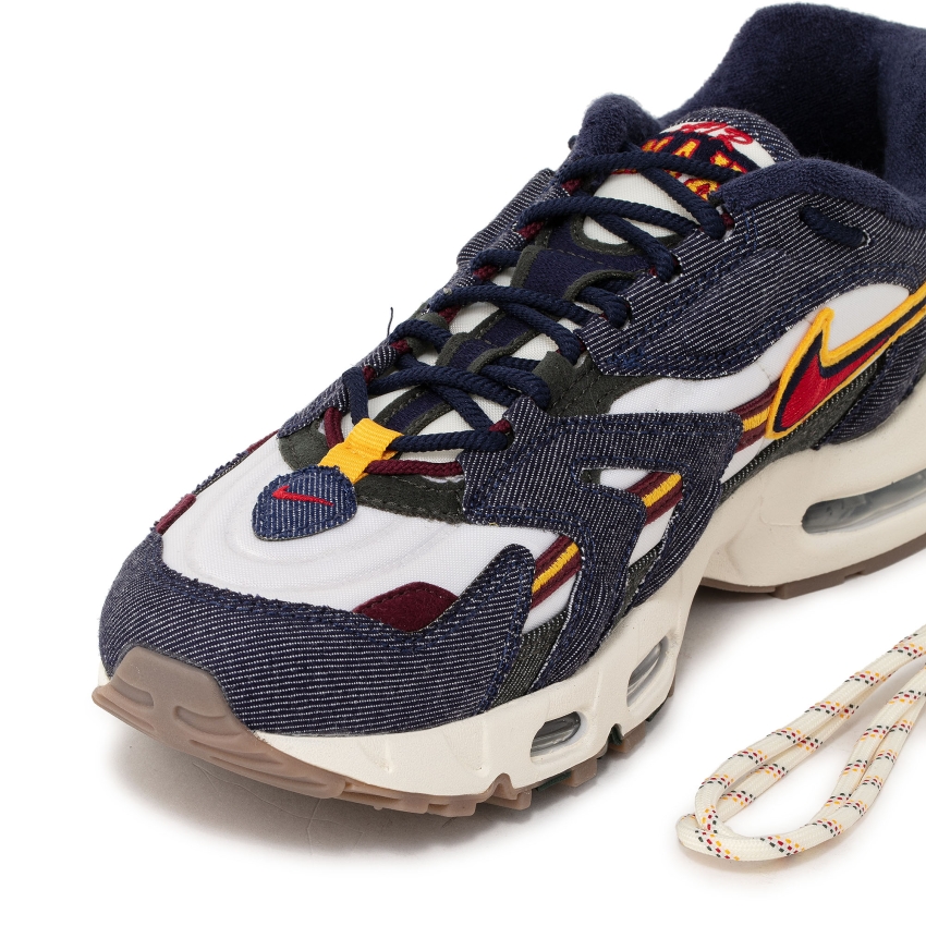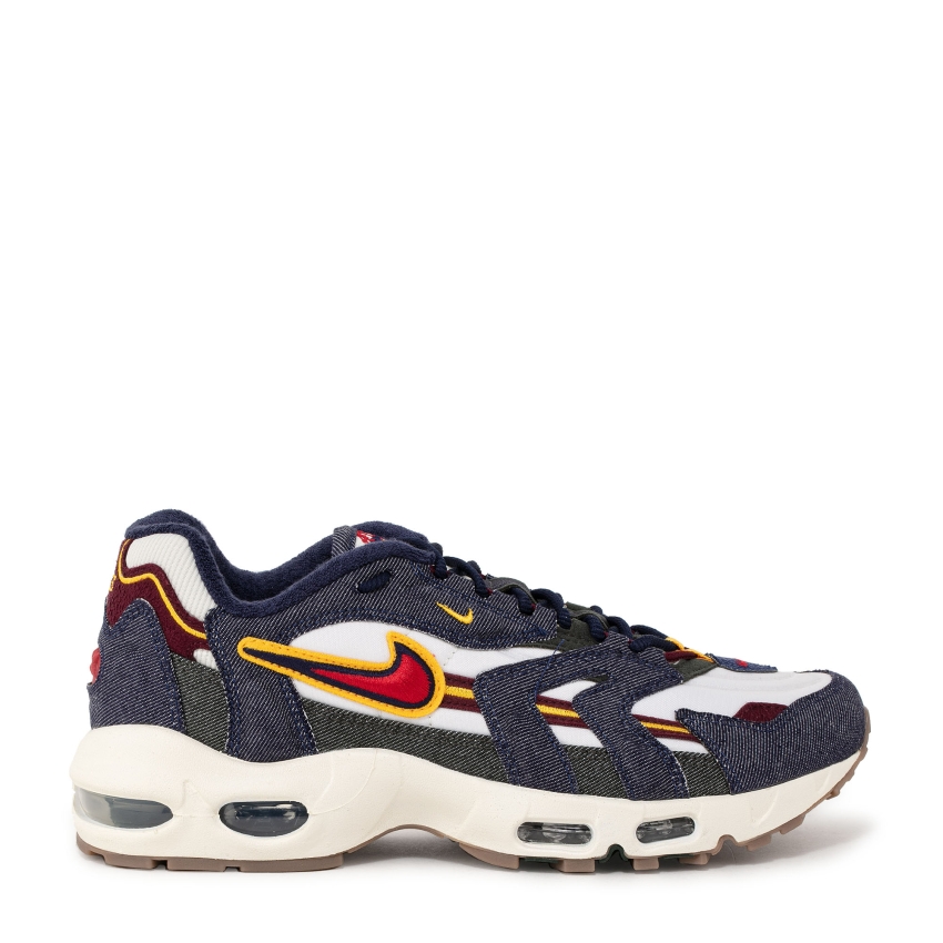 The Nike Air Max 96 II QS Blackened Blue sneakers are a new-season must-have. Made with a white underlayer, the pair boasts a dynamic and sturdy silhouette featuring thick, embroidery-accented strips, retro-stylized tongue branding, denim fabric details and a varsity-style Swoosh logo.
