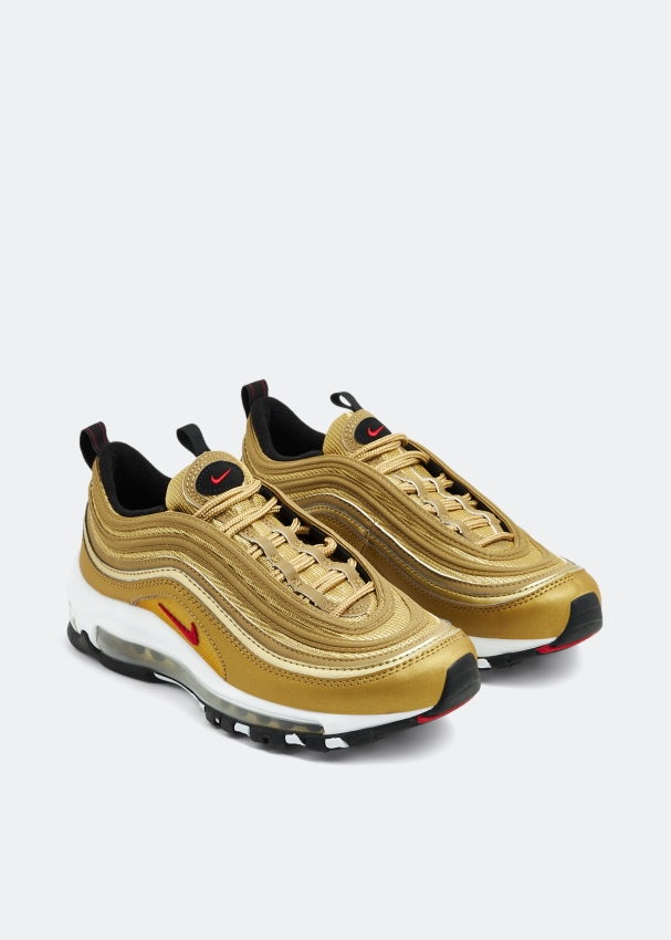 Celebrating the 25th anniversary of the beloved Air Max 97, this combines metallic gold, university red, black and white colours. Featuring a mesh upper, they're presented with reflective detailing and wavy leather overlays, an Air Max unit, and red Swooshes for added pop.