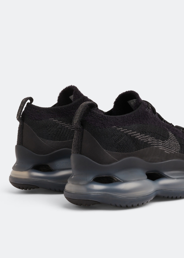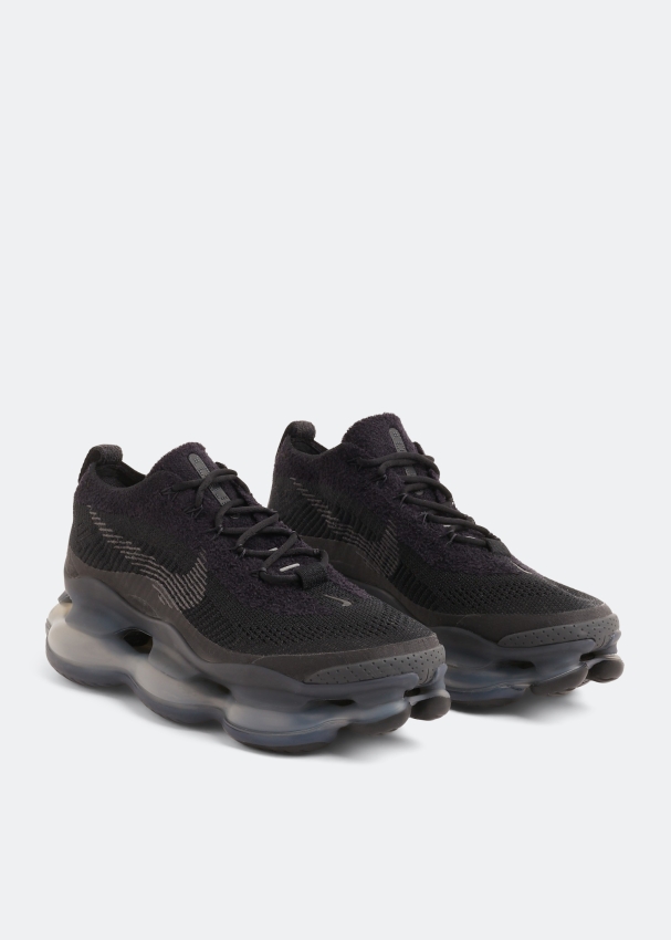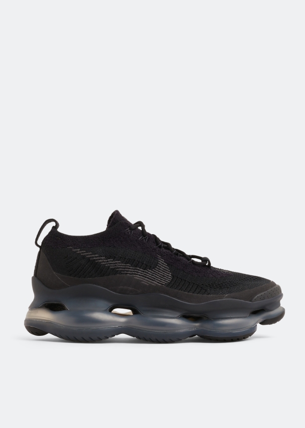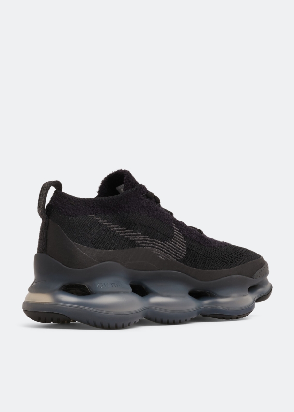 Presented in a dark knit, these Nike Air Max Scorpion 'Triple Black' sneakers are detailed with slightly contrasting Swooshes and branding. Other key features include a breathable woven upper, pull-tab and a smoky translucent outsole in the signature wide and oversized shape for a cushioned and supportive feel.